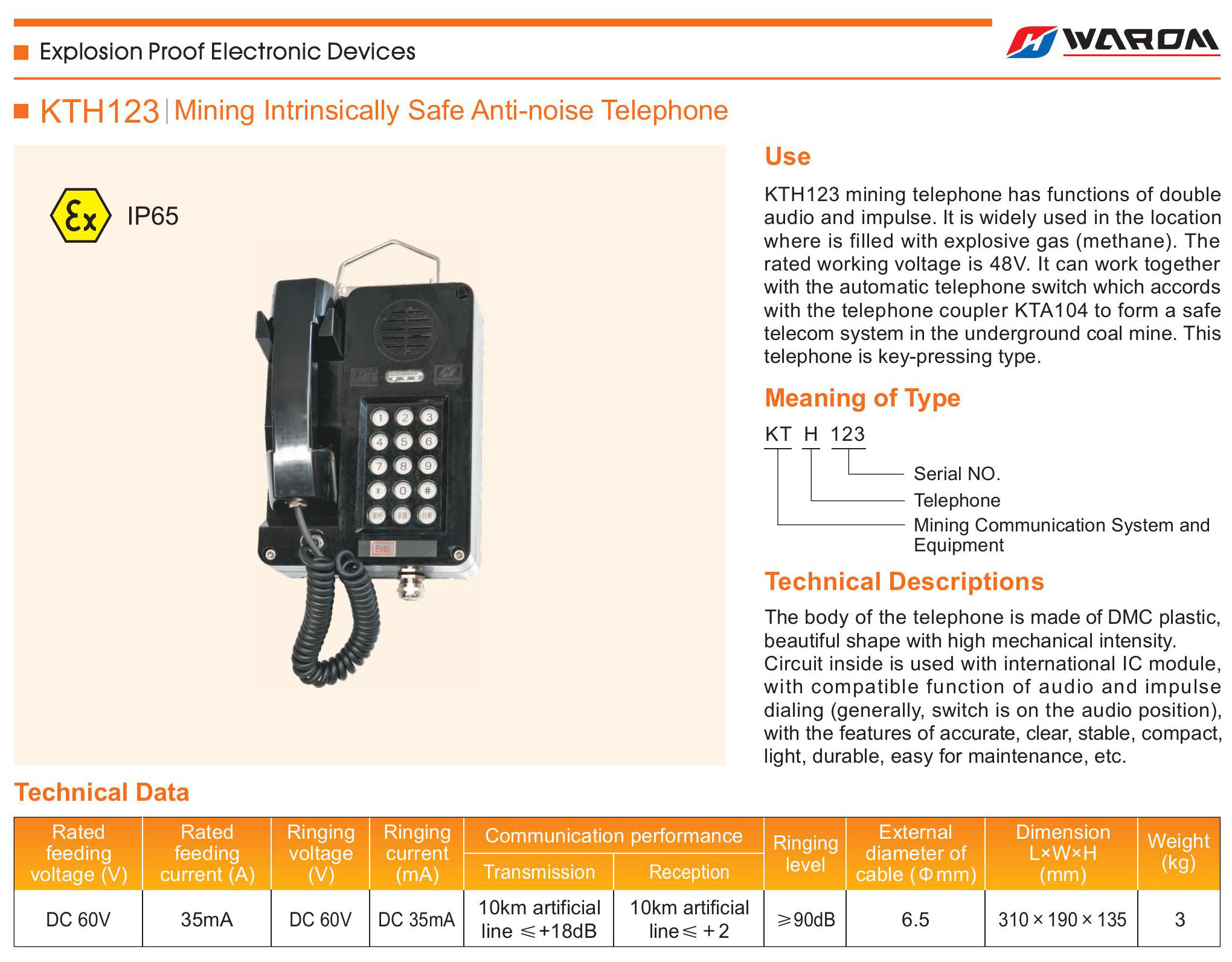 Use: KTH123 mining telephone has functions of double audio and impulse. It is widely used in the location where is filled with explosive gas (methane).The rated working voltage is 48V. It can work together with the automatic telephone switch which accords with the telephone coupler KTA104 to form a safe telecom system in the underground coal mine. This telephone is key-pressing type.