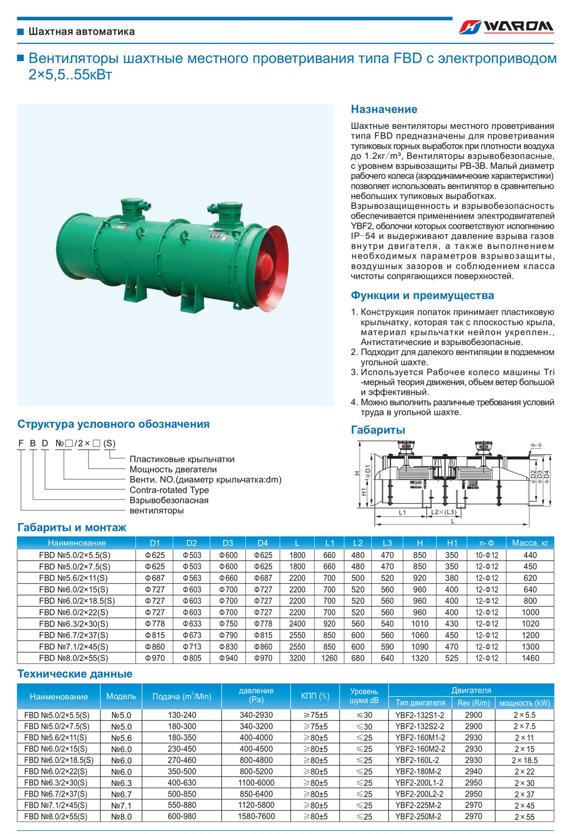 Главная > Продукты > Шахтная автоматика > Вентиляторы шахтные местного проветривания типа FBD с электроприводом 2×5,5..55кВт