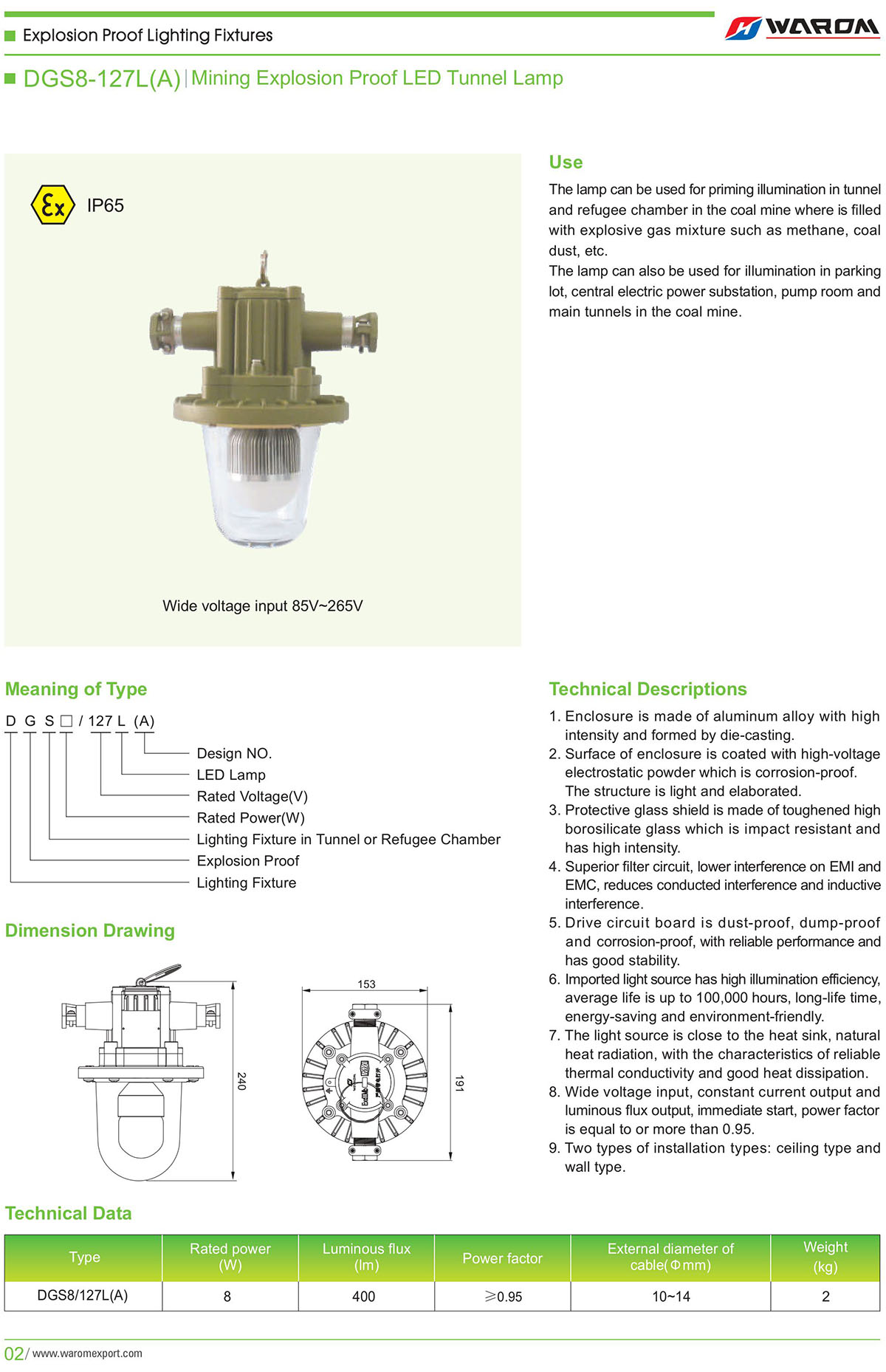 Use: The lamp can be used for priming illumination in tunnel Can be used for fixed lighting in the coal mine, under IP65 and refugee chamber in the coal mine where is filled -ground tunnel, comprehensive coalface, chamber with explosive gas mixture such as methane, coal room, substation, pump room, parking lot, etc. Can be used for fixed lighting in the coal mine and in dust, etc. dangerous environment where have explosive gas The lamp can also be used for illumination in parking mixture of methane, coal dust, etc. lot, central electric power substation, pump room and main tunnels in the coal mine.