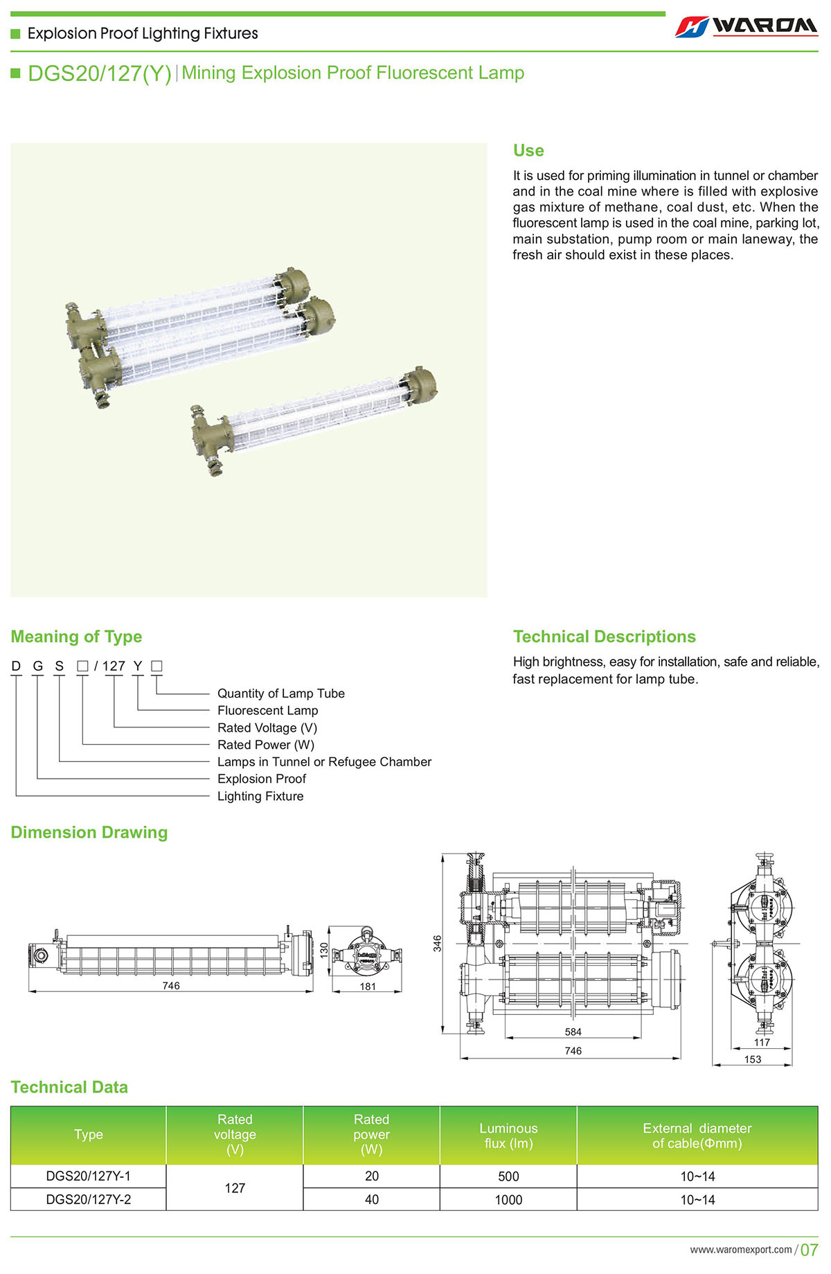 Use: It is used for priming illumination in tunnel or chamber and in the coal mine where is filled with explosive gas mixture of methane, coal dust, etc. When the fluores cent lamp is used in the coal mine,parking lot, main substation,pump room or main laneway, the fresh air should exist in these places.