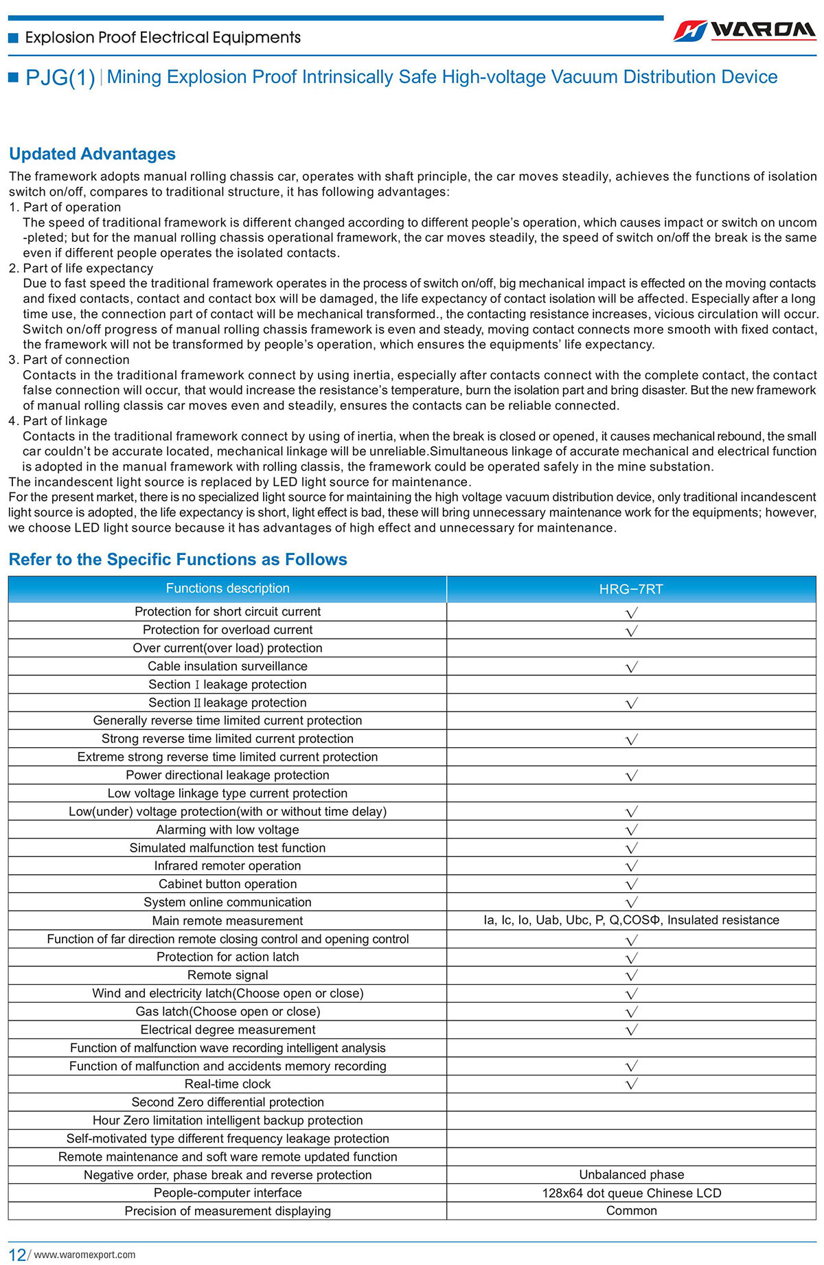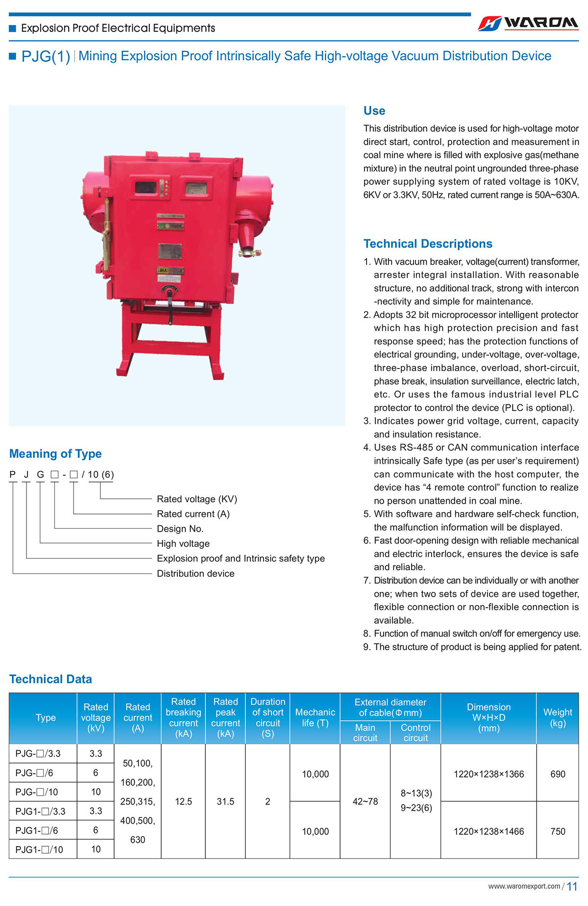 Use: This distribution device is used for high-voltage motor direct start, control, protection and measurement in coal mine where is filled with explosive gas(methane mixture) in the neutral point ungrounded three-phase power supplying system of rated voltage is 10KV,6KV or3.3KV,50Hz,rated current range is 50A~630A