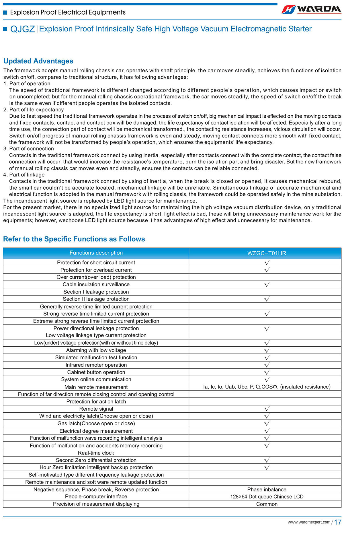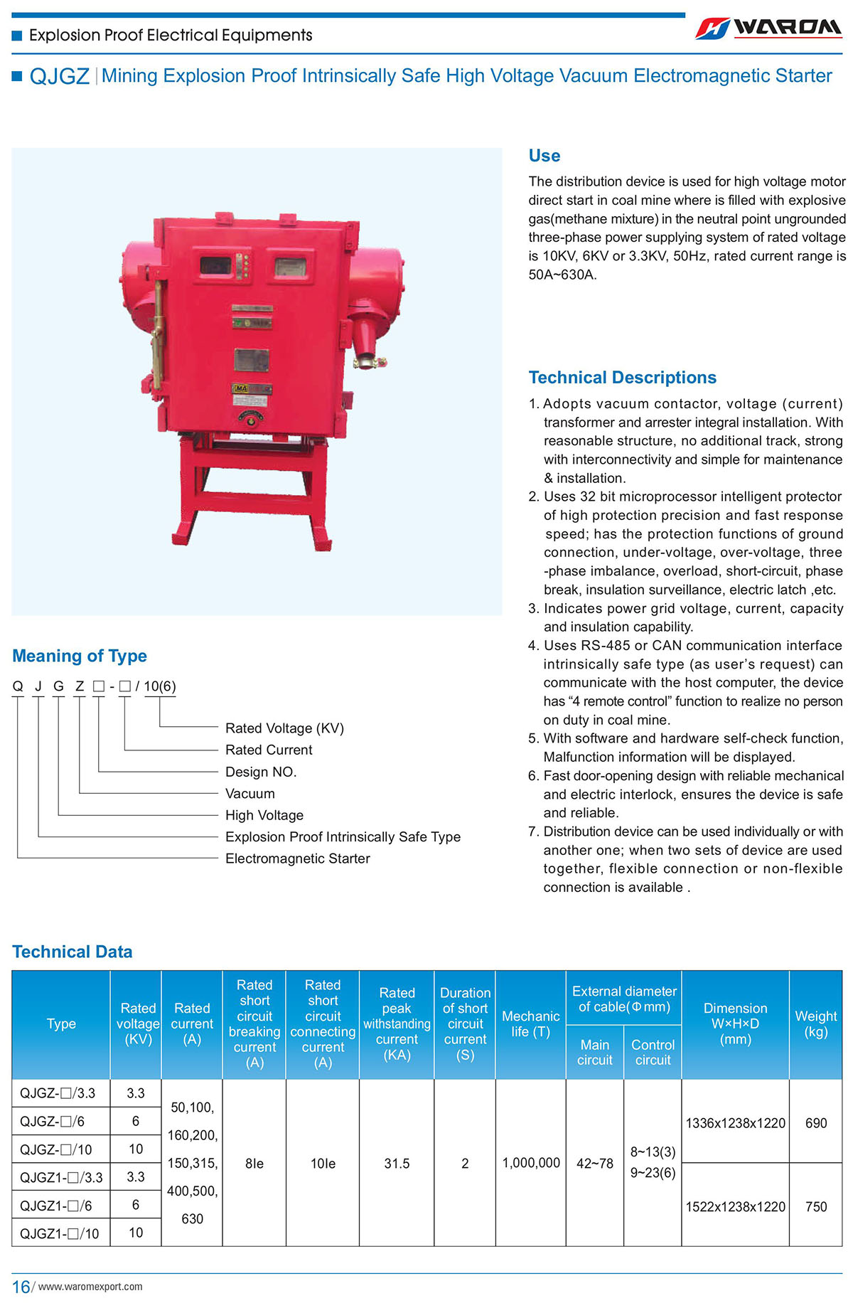 Use: The distribution device is used for high voltage motor direct start in coal mine where is filled with explosive gas(methane mixture) in the neutral point ungrounded three-phase power supplying system of rated voltage is 10KV,6KV or 3.3KV,50Hz,rated current range is50A~630A.