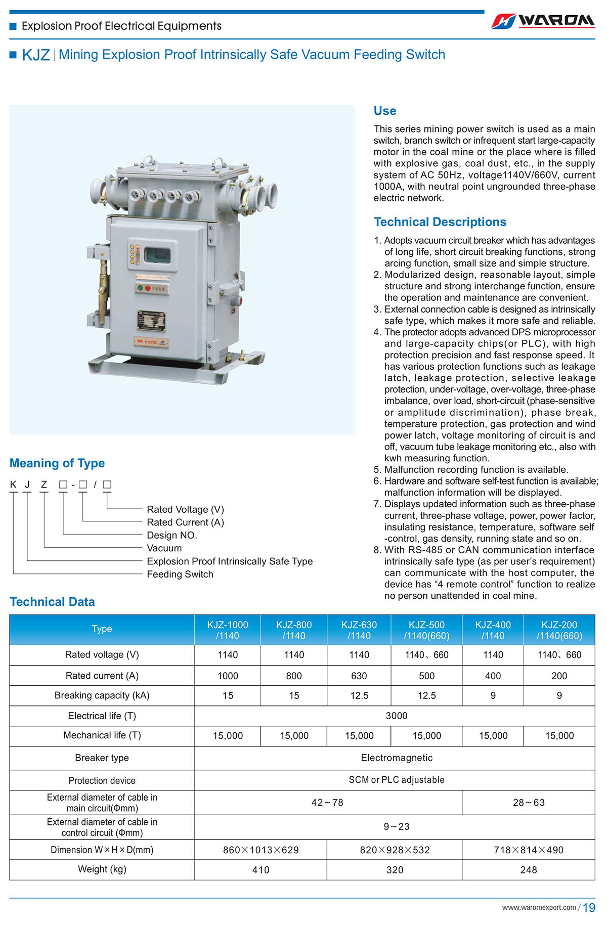 Use: This series mining power switch is used as a main switch, branch switch or infrequent start large-capacity motor in the coal mine or the place where is filled with explosive gas, coal dust, etc., in the supply system of AC 50Hz,voltage1140V/660V,current1000A,with neutral point ungrounded three-phase electric network.