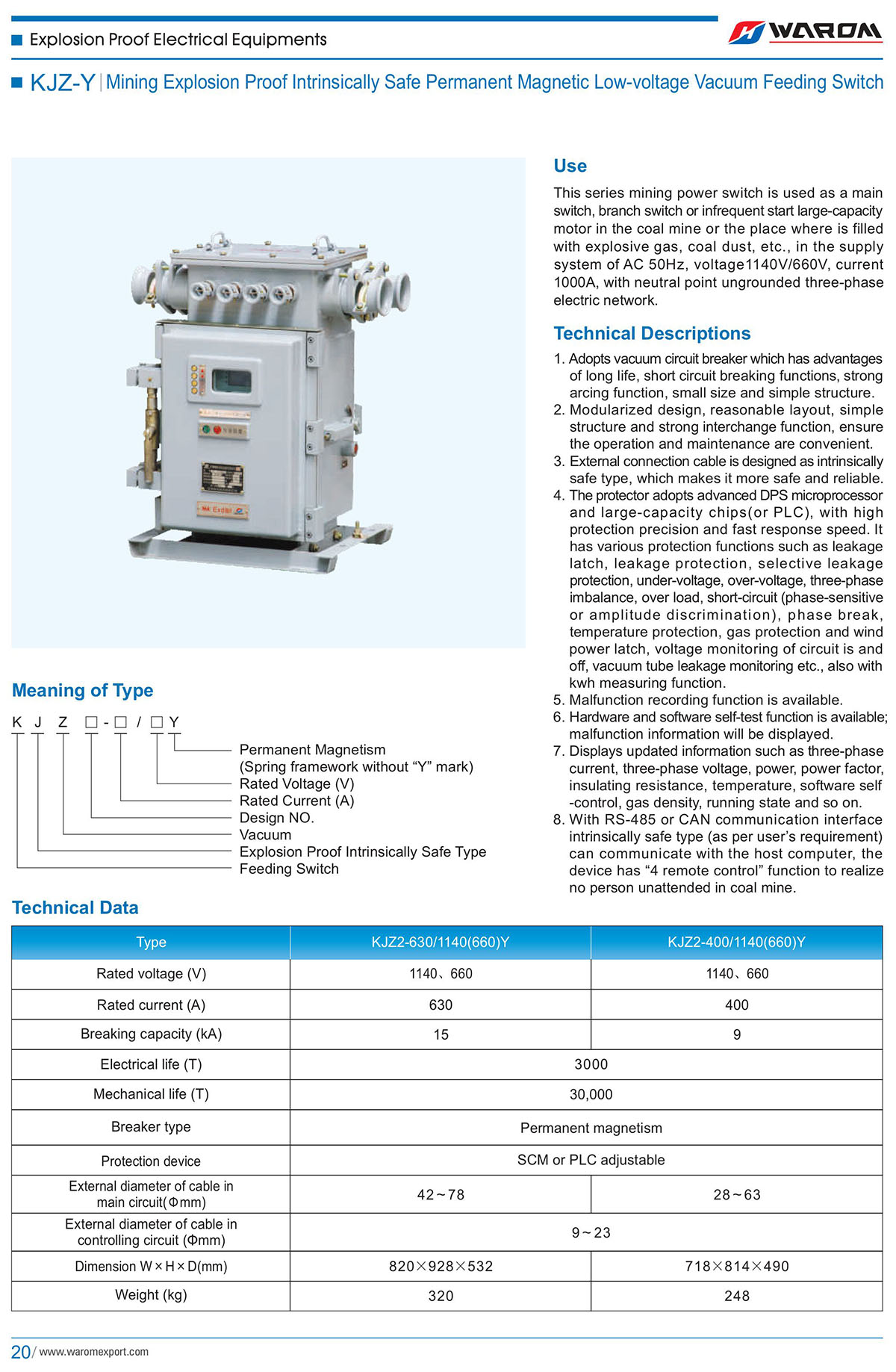 Use: This series mining power switch is used as a main switch, branch switch or infrequent start large-capacity motor in the coal mine or the place where is filled with explosive gas, coal dust, etc., in the supply system of AC 50Hz,voltage1140V/660V,current1000A, with neutral point ungrounded three-phase electric network.