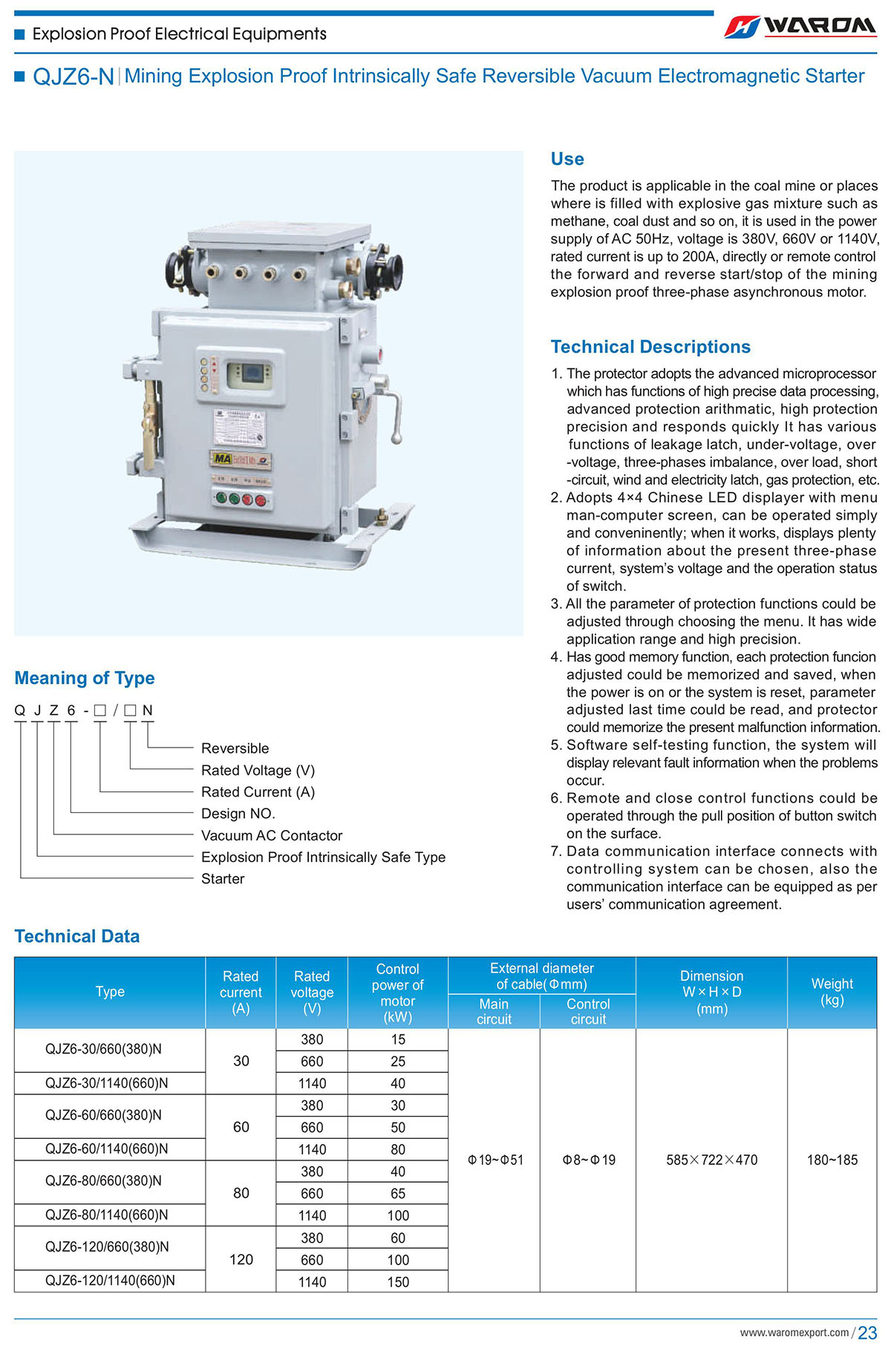 Use: The product is applicable in the coal mine or places where is filled with explosive gas mixture such as methane, coal dust and so on, it is used in the power supply of AC 50Hz,voltage is 380V, 660V or 1140V, rated current is up to 200A,directly or remote contral the forward and reverse start/stop of the mining explosion proof three-phase asynchronous motor.