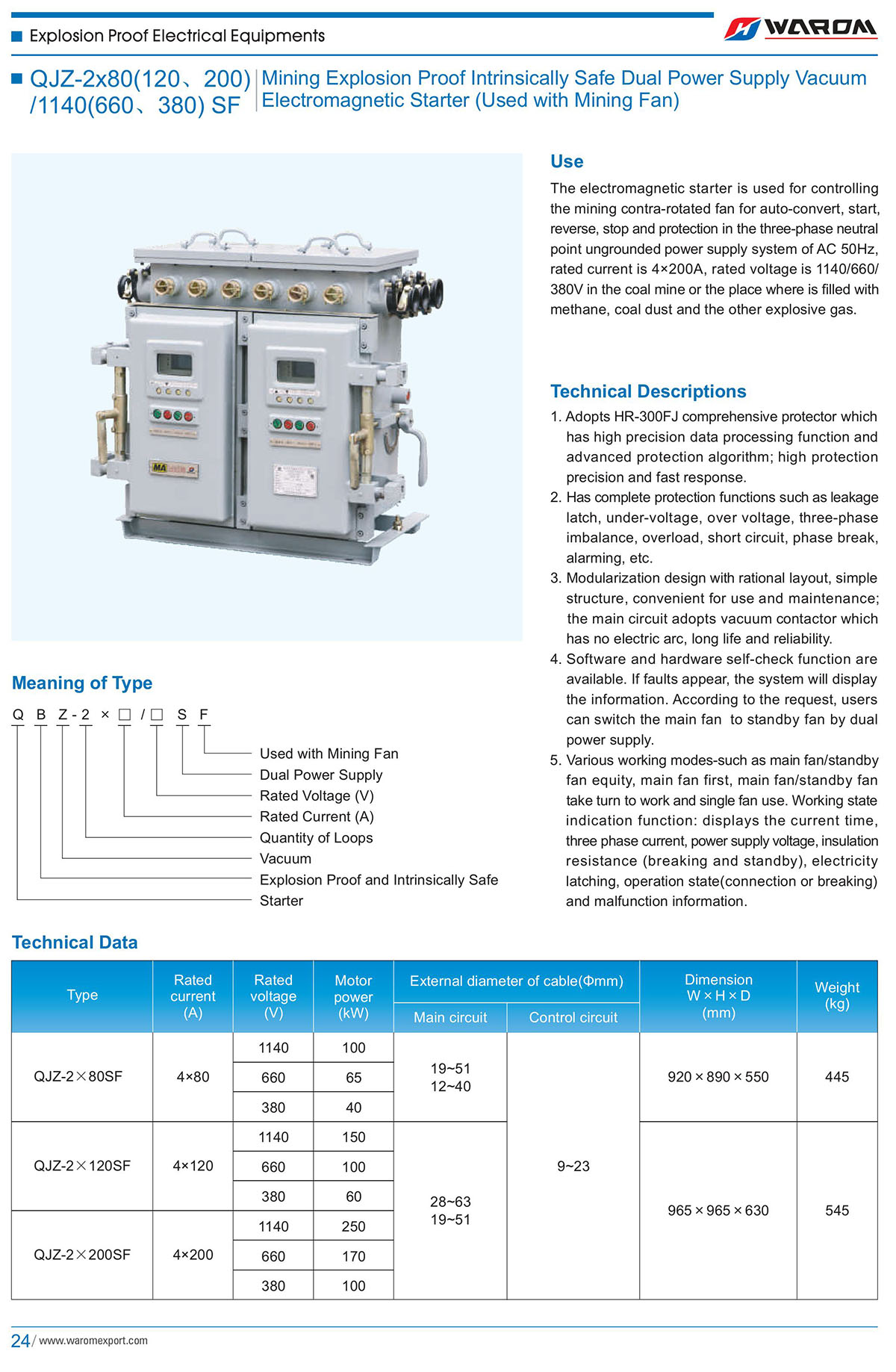Use: The electromagnetic starter is used for controlling the mining contra-rotated fan for auto-convert, start, reverse, stop and protection in the three-phase neutral point ungrounded power supply system ofAC 50Hz, rated current is 4x200A,rated voltage is 1140/660/380V in the coal mine or the place where is filled with methane, coal dust and the other explosive gas.