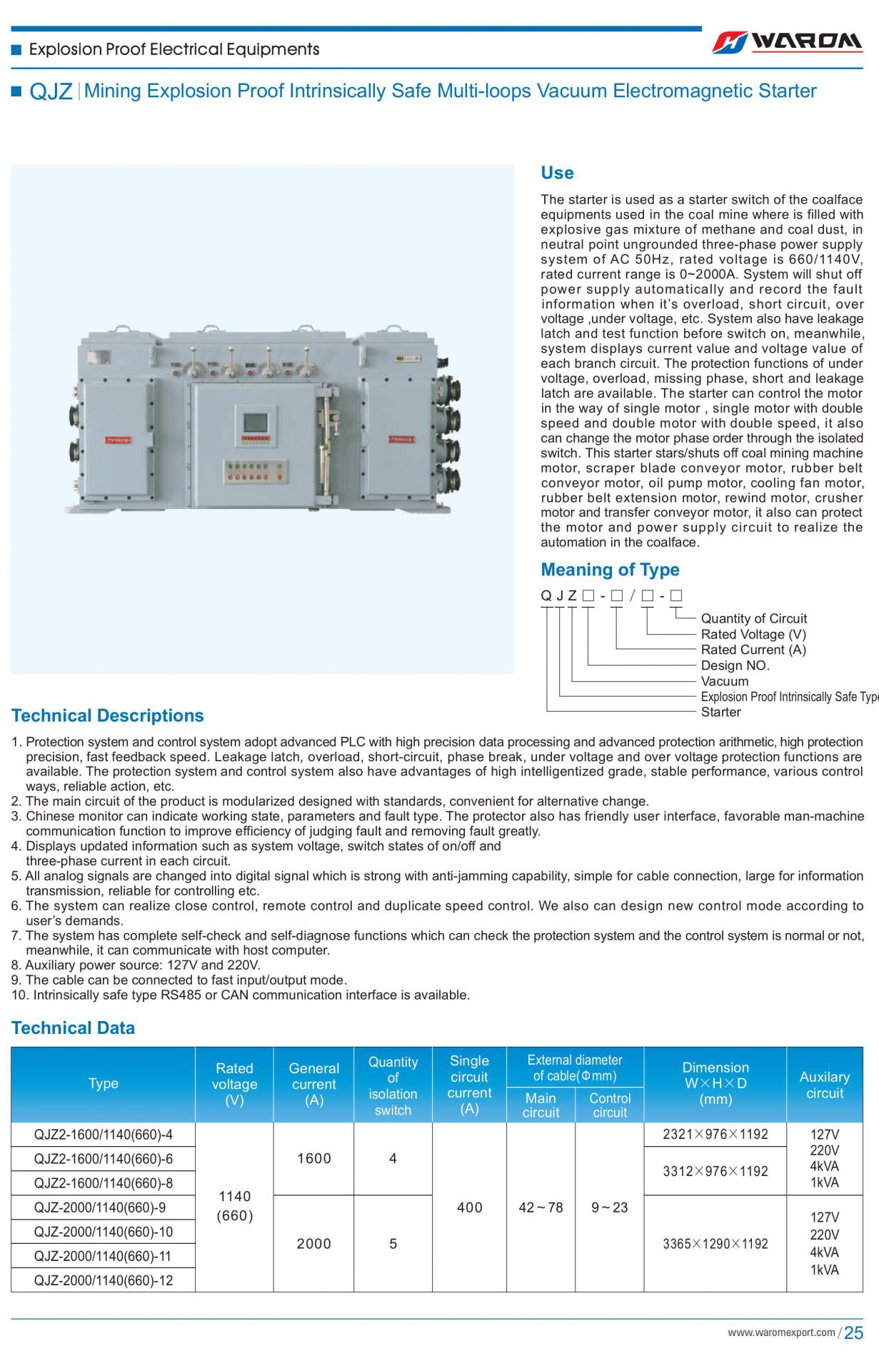 Use: The starter is used as a starter switch of the coalface equipments used in the coal mine where is filled with explosive gas mixture of methane and coal dust, in neutral point ungrounded three-phase power supply system of AC 50Hz, rated voltage is 660/1140V, rated current range is 0-2000A.System wil shut off power supply auto matically and record the fault information when it's overload, short circuit, over voltage ,under voltage, etc. System also have leakage latch and test function before switch on, meanwhile, system displays current value and voltage value of each branch circuit.The protection functions of under voltage, overload, missing phase, short and leakage latch are available. The starter can control the motor in the way of single motor , single motor with double speed and double motor with double speed, it also can change the motor phase order through the isolated switch. This starter stars/shuts off coal mining machine motor, scraper blade conveyor motor, rubber belt conveyor motor, oil pump motor, cooling fan motor, rubber belt extension motor, rewind motor, crusher motor and transfer conveyor motor, it also can prolect the motor and power supply circuit to realize the automation in the coalface.