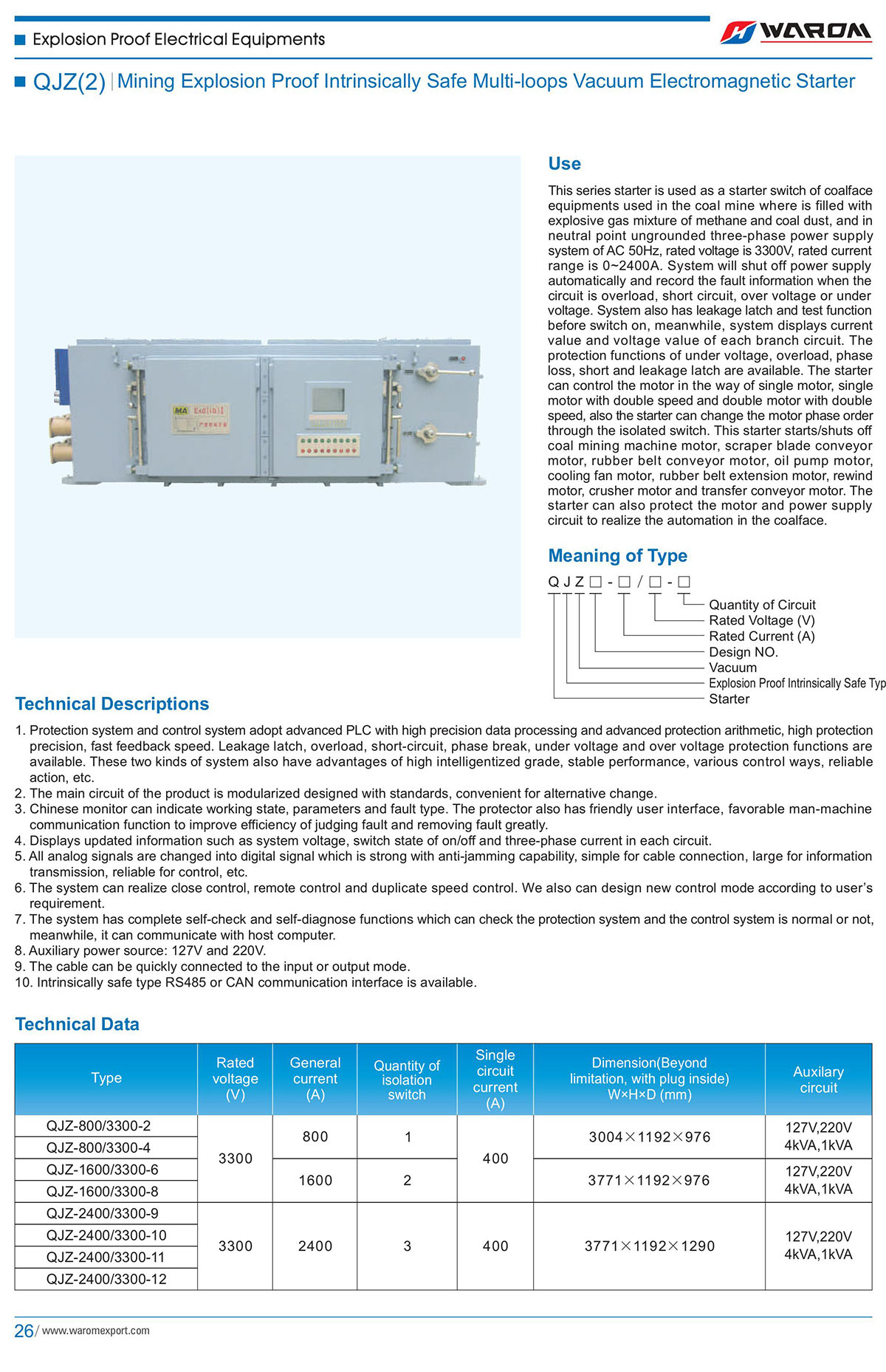 Use: This series starer is used as a starter switch of coalface equipments used in the coal mine where is filled with explosive gas mixture of methane and coal dust, and in neutral point ungrounded three-phase power supply system of AC 50Hz,rated voltage is 3300V, rated current range is 0-2400A. System will shut off power supply automafically and record the fault information when the circuit is overload, short circuit, over voltage or under voltaga.System also has leakage latch and test function before switch on, meanwhile, system displays current value and voltage value of each branch circuit.The protection functions ofunder voltage, overload, phase loss, short and leakage latch are available.The starter can control the motor in the way of single motor, single motor with double speed and double motor with double speed, also the starter can change the motor phase order through the isolated switch. This starter starts/shuts off coal mining machine motor, scraper blade conveyor motor, rubber belt conveyar motor, oil pump motor, cooling fan motor, rubber belt extension motor, rewind motor, crusher motor and transfer conveyor molor. The starter can also protect the motor and power supply circuit to realize the automation in the coalface.